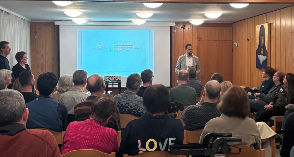 Ein erstes Infotreffen zum genossenschaftlichen Wohnprojekt Bodolz fand am 21.1.2026 im Gemeinderaum der Kirche St. Johannes statt. Insgesamt waren 35 Personen anwesend, darunter 10 Mitglieder von quartier4 sowie weitere am gemeinschaftlichen Wohnen Interessierte in einer guten Mischung aus älteren und jüngeren Menschen. Auch der Bodolzer Bürgermeister Felix Eisenbach war den ganzen Abend dabei.